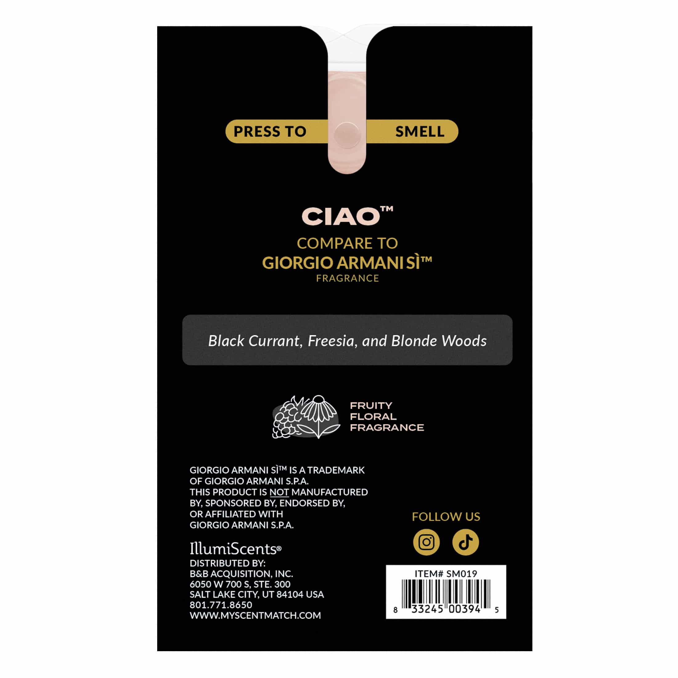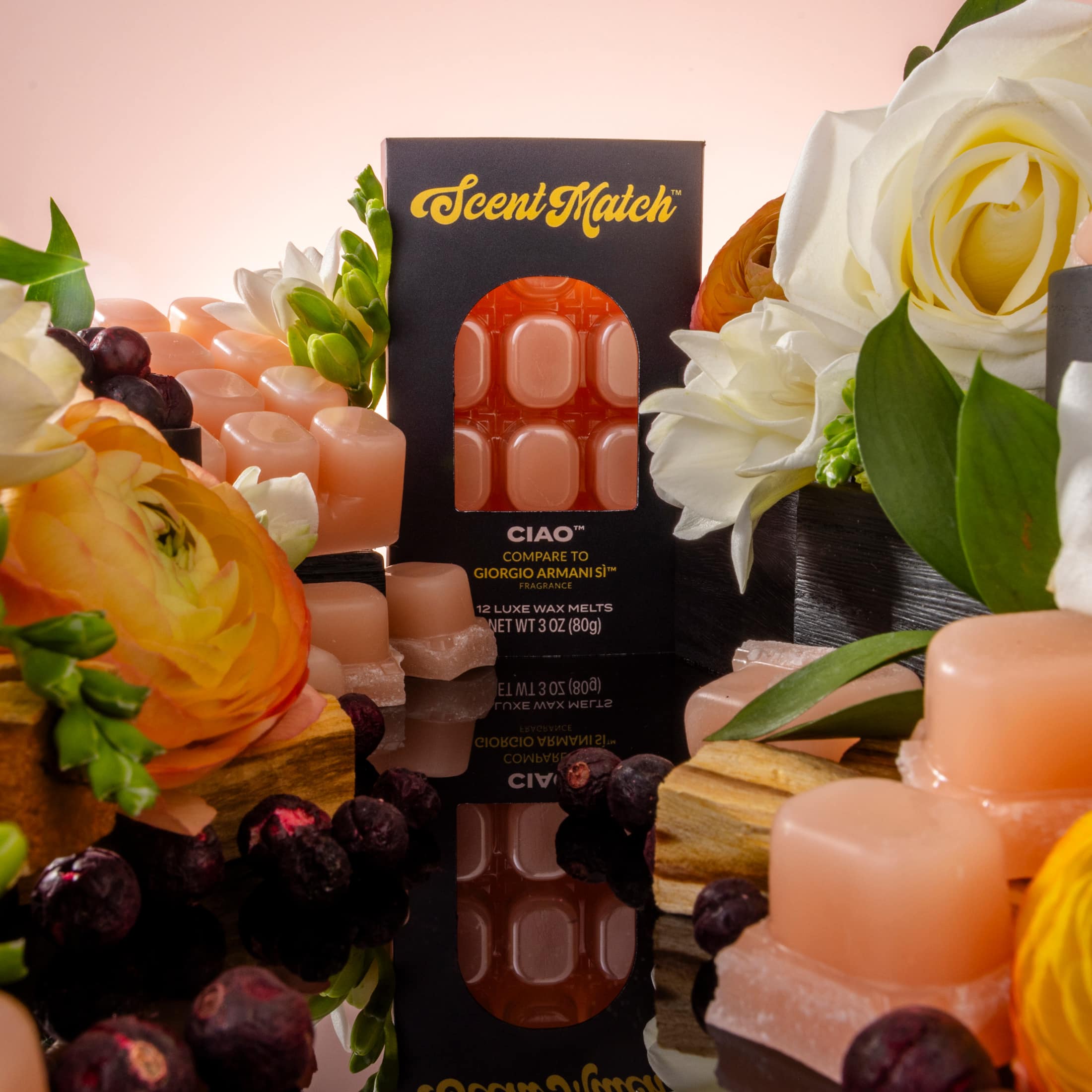 ScentMatch™ Ciao™ is the ultimate balance of classy and cool. This wax melt, compare to Giorgio Armani Si®, features notes of rose petals, vanilla, and rich woods that create a warm, feminine vibe. Melt it when you’re getting ready to go out, or staying in and owning the moment.